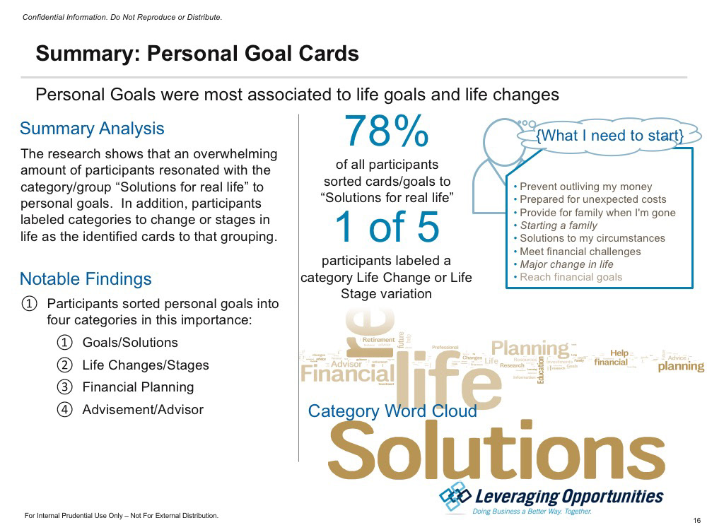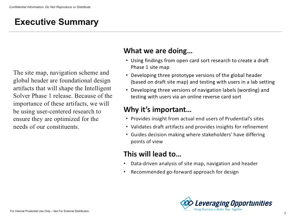 He effectively coordinated designers, Prudential researchers, senior stakeholders and a 3rd party vendor to reach this outcome. I also thought Josh did good work in client workshop sessions. He was able to clearly articulate his methodology and facilitate discussions that were valuable to both the client in articulating their objectives and aligning on approach, as well as for the quality of the IA research activities.”